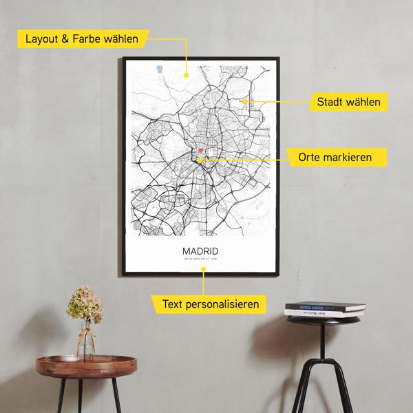 Wähle Farben und Layouts, die perfekt zu dir passen. Ob als klassische Karte in schwarz-weiß oder in modernen Farben. Bei Cartida kannst du ein Design in deinen Lieblingsfarben wählen. Erstelle eine Variante von Madrid, die perfekt zu dir und deiner Wohnung passt.