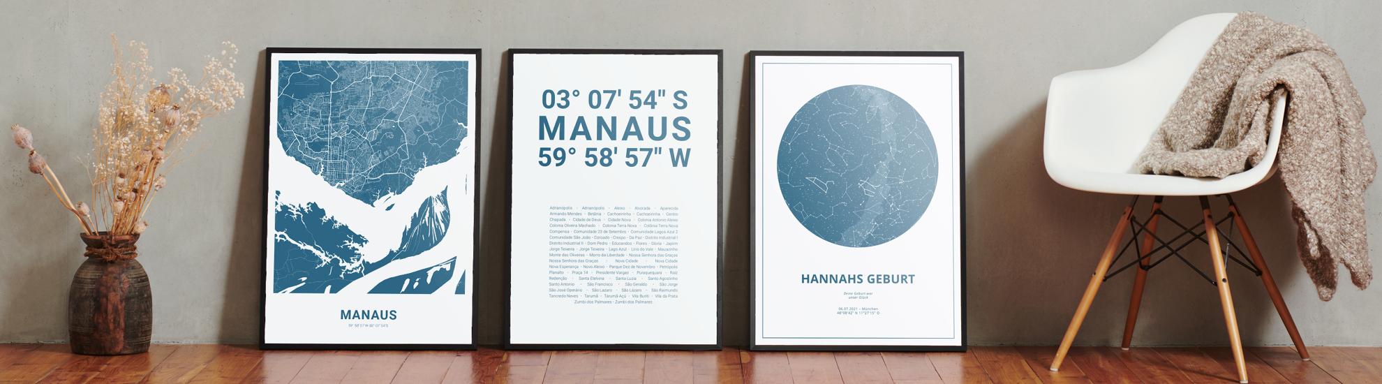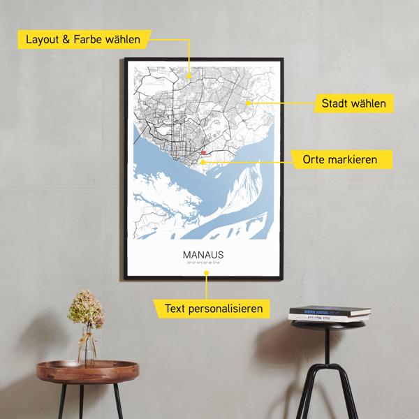 Wähle Farben und Layouts, die perfekt zu dir passen. Ob als klassische Karte in schwarz-weiß oder in modernen Farben. Bei Cartida kannst du ein Design in deinen Lieblingsfarben wählen. Erstelle eine Variante von Manaus, die perfekt zu dir und deiner Wohnung passt.