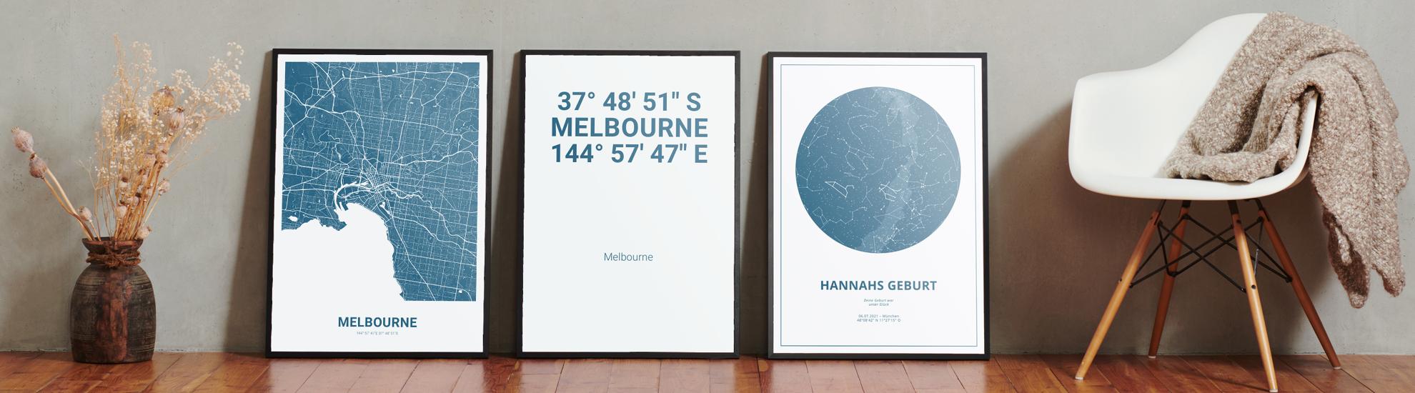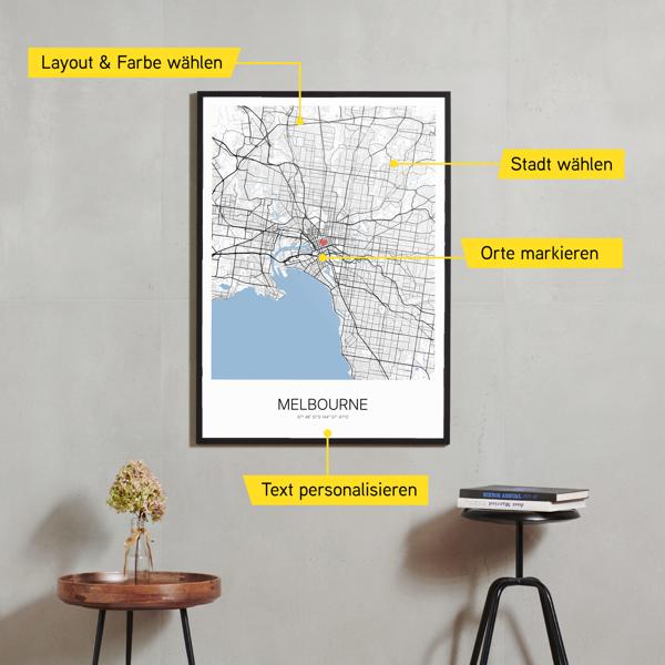 Wähle Farben und Layouts, die perfekt zu dir passen. Ob als klassische Karte in schwarz-weiß oder in modernen Farben. Bei Cartida kannst du ein Design in deinen Lieblingsfarben wählen. Erstelle eine Variante von Melbourne, die perfekt zu dir und deiner Wohnung passt.