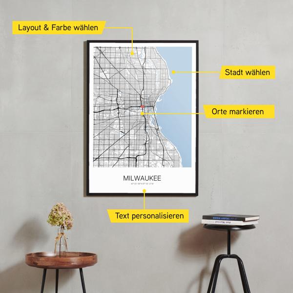 Wähle Farben und Layouts, die perfekt zu dir passen. Ob als klassische Karte in schwarz-weiß oder in modernen Farben. Bei Cartida kannst du ein Design in deinen Lieblingsfarben wählen. Erstelle eine Variante von Milwaukee, die perfekt zu dir und deiner Wohnung passt.