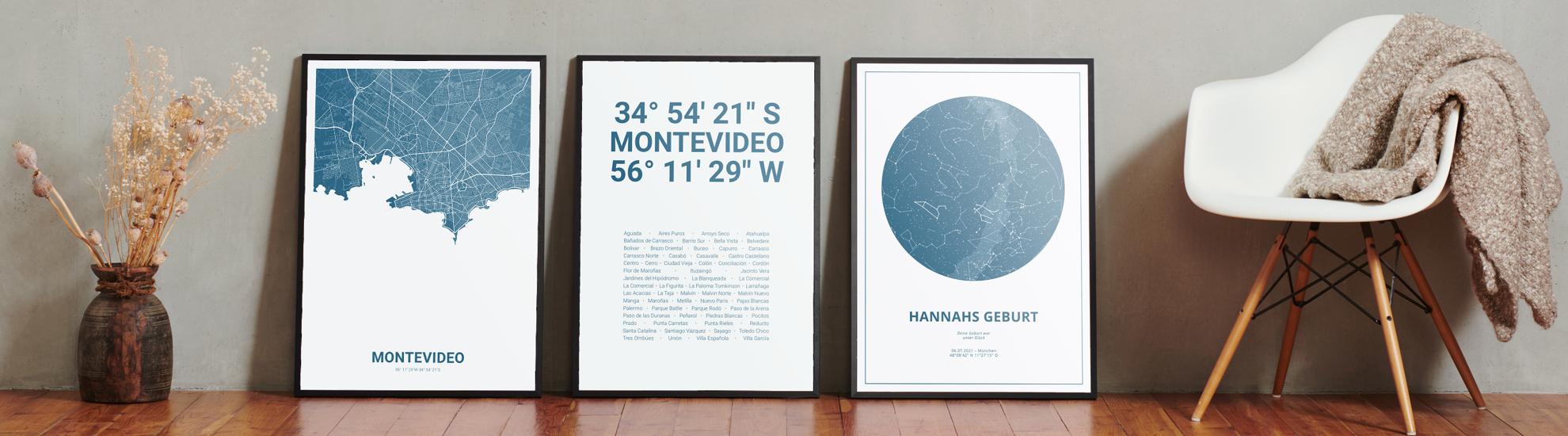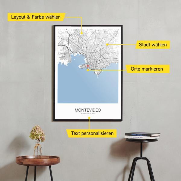 Wähle Farben und Layouts, die perfekt zu dir passen. Ob als klassische Karte in schwarz-weiß oder in modernen Farben. Bei Cartida kannst du ein Design in deinen Lieblingsfarben wählen. Erstelle eine Variante von Montevideo, die perfekt zu dir und deiner Wohnung passt.