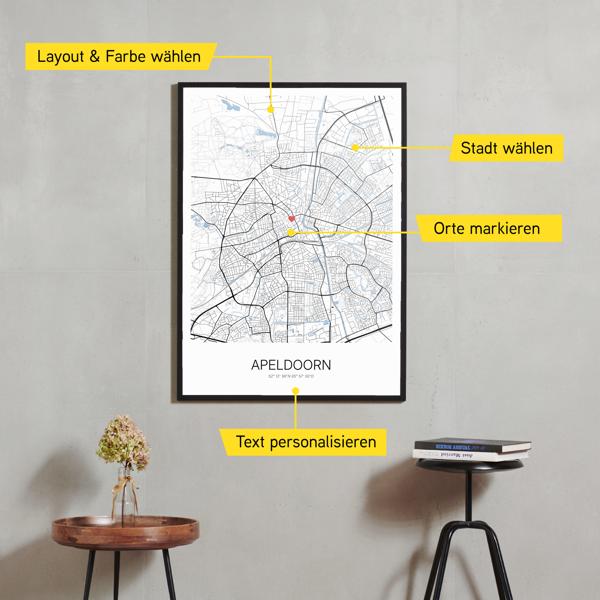 Wähle Farben und Layouts, die perfekt zu dir passen. Ob als klassische Karte in schwarz-weiß oder in modernen Farben. Bei Cartida kannst du ein Design in deinen Lieblingsfarben wählen. Erstelle eine Variante von Apeldoorn, die perfekt zu dir und deiner Wohnung passt.