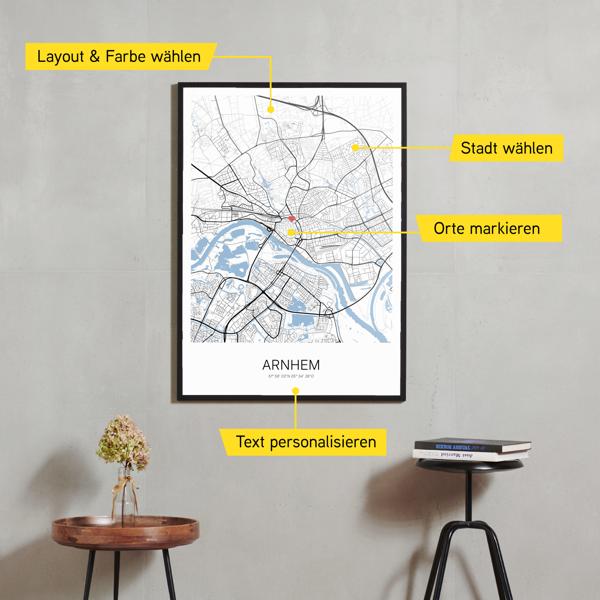 Wähle Farben und Layouts, die perfekt zu dir passen. Ob als klassische Karte in schwarz-weiß oder in modernen Farben. Bei Cartida kannst du ein Design in deinen Lieblingsfarben wählen. Erstelle eine Variante von Arnhem, die perfekt zu dir und deiner Wohnung passt.