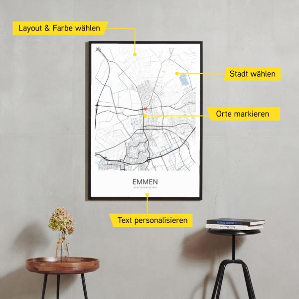 Wähle Farben und Layouts, die perfekt zu dir passen. Ob als klassische Karte in schwarz-weiß oder in modernen Farben. Bei Cartida kannst du ein Design in deinen Lieblingsfarben wählen. Erstelle eine Variante von Emmen, die perfekt zu dir und deiner Wohnung passt.