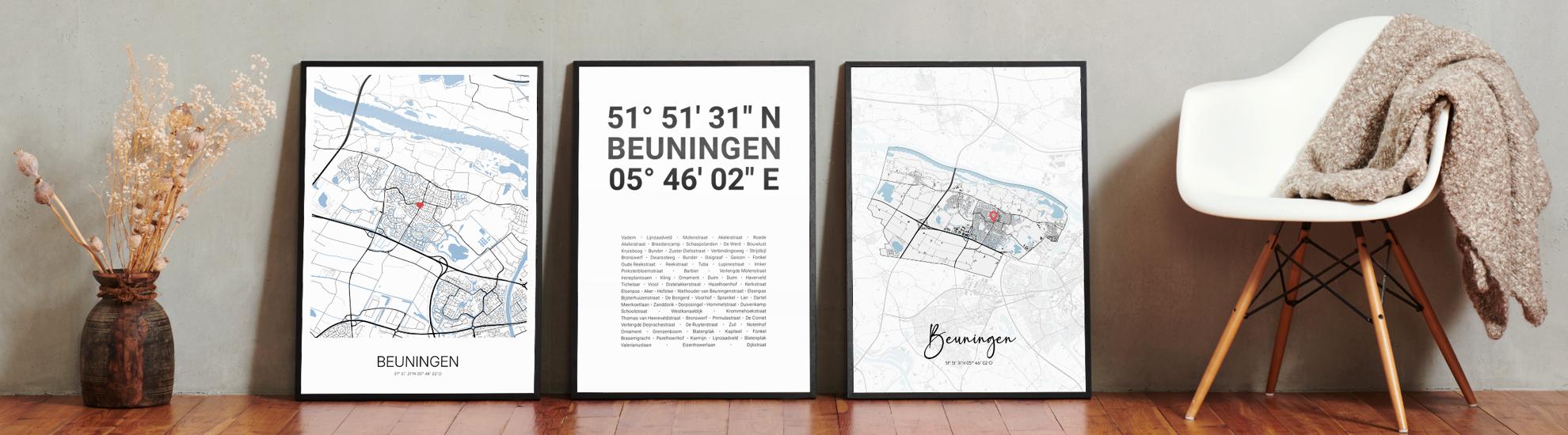 Wähle Farben und Layouts, die perfekt zu dir passen. Ob als klassische Karte in schwarz-weiß oder in modernen Farben. Bei Cartida kannst du ein Design in deinen Lieblingsfarben wählen. Erstelle eine Variante von Beuningen, die perfekt zu dir und deiner Wohnung passt.
