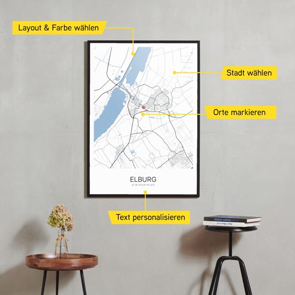 Wähle Farben und Layouts, die perfekt zu dir passen. Ob als klassische Karte in schwarz-weiß oder in modernen Farben. Bei Cartida kannst du ein Design in deinen Lieblingsfarben wählen. Erstelle eine Variante von Elburg, die perfekt zu dir und deiner Wohnung passt.