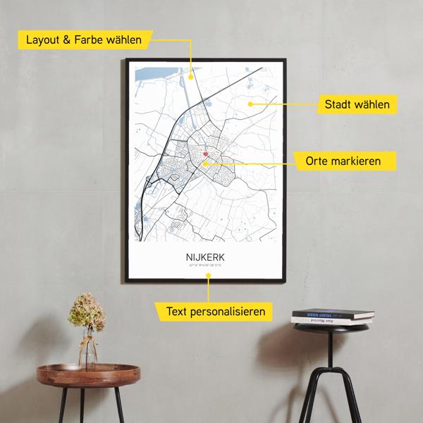 Wähle Farben und Layouts, die perfekt zu dir passen. Ob als klassische Karte in schwarz-weiß oder in modernen Farben. Bei Cartida kannst du ein Design in deinen Lieblingsfarben wählen. Erstelle eine Variante von Nijkerk, die perfekt zu dir und deiner Wohnung passt.