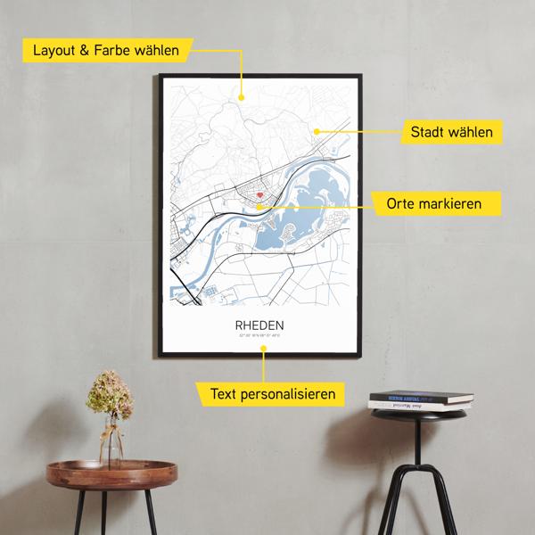 Wähle Farben und Layouts, die perfekt zu dir passen. Ob als klassische Karte in schwarz-weiß oder in modernen Farben. Bei Cartida kannst du ein Design in deinen Lieblingsfarben wählen. Erstelle eine Variante von Rheden, die perfekt zu dir und deiner Wohnung passt.