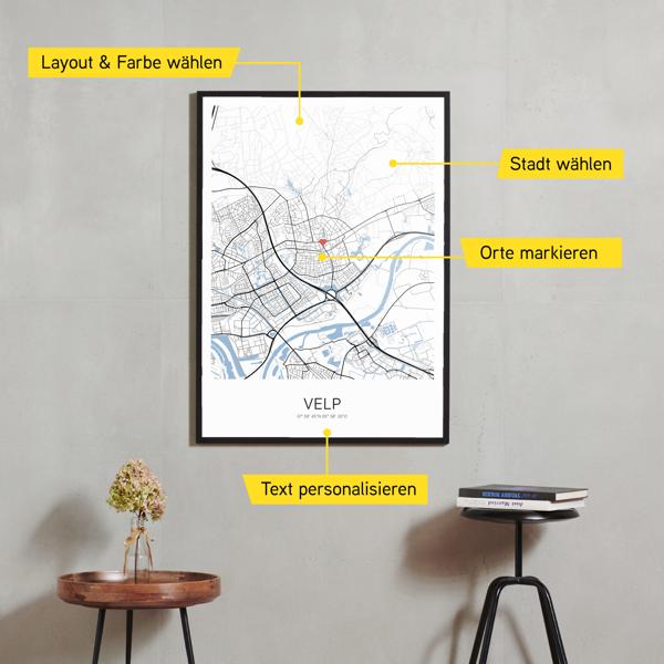 Wähle Farben und Layouts, die perfekt zu dir passen. Ob als klassische Karte in schwarz-weiß oder in modernen Farben. Bei Cartida kannst du ein Design in deinen Lieblingsfarben wählen. Erstelle eine Variante von Velp, die perfekt zu dir und deiner Wohnung passt.