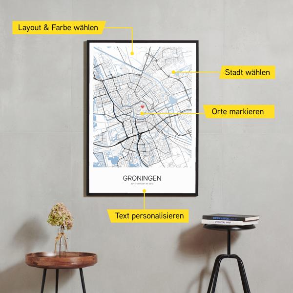 Wähle Farben und Layouts, die perfekt zu dir passen. Ob als klassische Karte in schwarz-weiß oder in modernen Farben. Bei Cartida kannst du ein Design in deinen Lieblingsfarben wählen. Erstelle eine Variante von Groningen, die perfekt zu dir und deiner Wohnung passt.