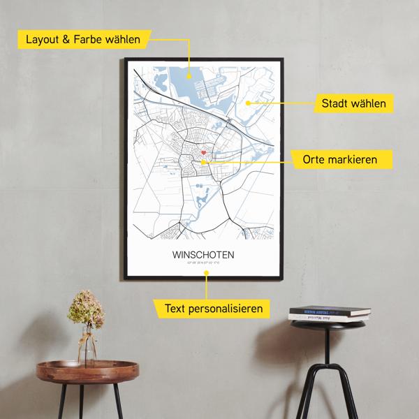 Wähle Farben und Layouts, die perfekt zu dir passen. Ob als klassische Karte in schwarz-weiß oder in modernen Farben. Bei Cartida kannst du ein Design in deinen Lieblingsfarben wählen. Erstelle eine Variante von Winschoten, die perfekt zu dir und deiner Wohnung passt.