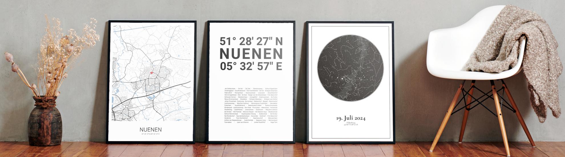 Wähle Farben und Layouts, die perfekt zu dir passen. Ob als klassische Karte in schwarz-weiß oder in modernen Farben. Bei Cartida kannst du ein Design in deinen Lieblingsfarben wählen. Erstelle eine Variante von Nuenen, die perfekt zu dir und deiner Wohnung passt.