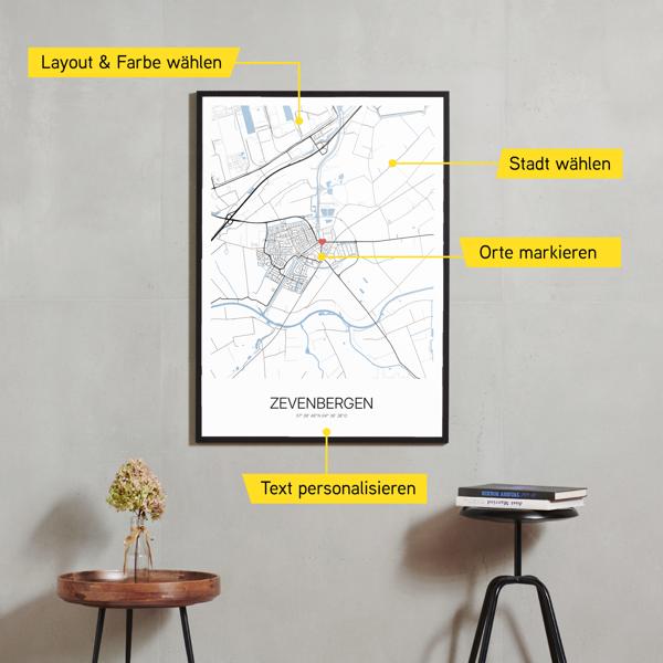 Wähle Farben und Layouts, die perfekt zu dir passen. Ob als klassische Karte in schwarz-weiß oder in modernen Farben. Bei Cartida kannst du ein Design in deinen Lieblingsfarben wählen. Erstelle eine Variante von Zevenbergen, die perfekt zu dir und deiner Wohnung passt.