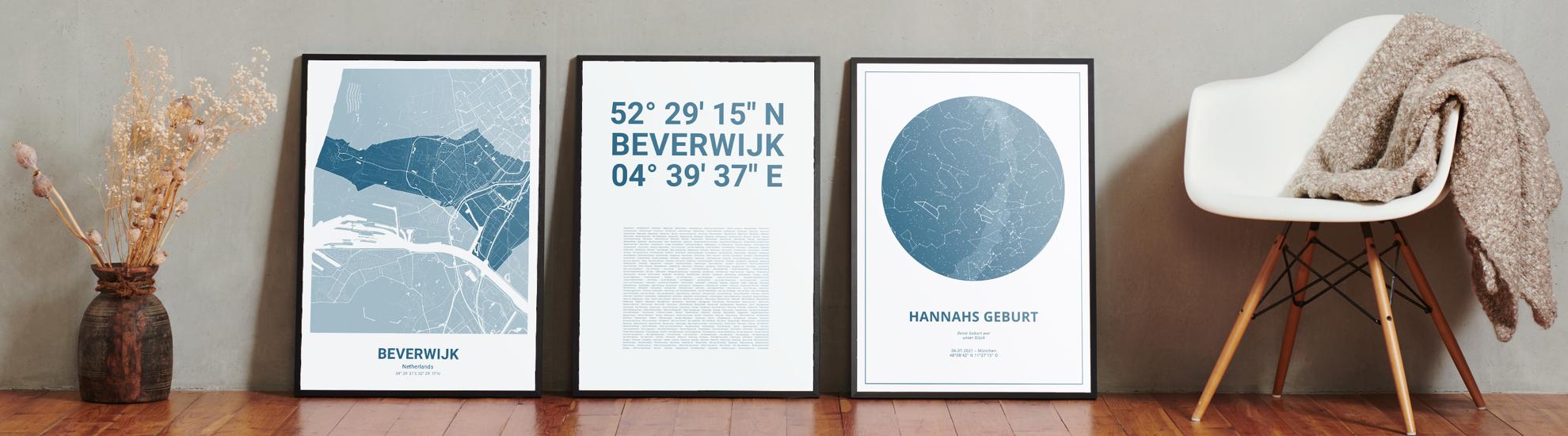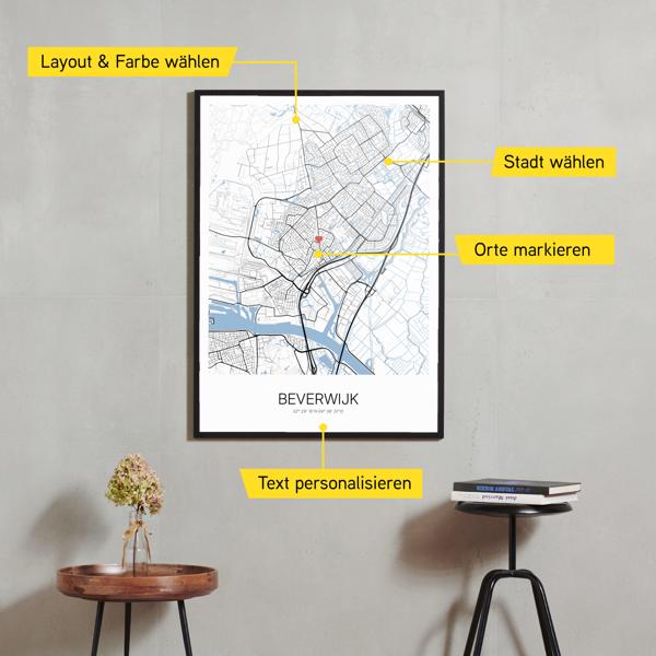 Wähle Farben und Layouts, die perfekt zu dir passen. Ob als klassische Karte in schwarz-weiß oder in modernen Farben. Bei Cartida kannst du ein Design in deinen Lieblingsfarben wählen. Erstelle eine Variante von Beverwijk, die perfekt zu dir und deiner Wohnung passt.
