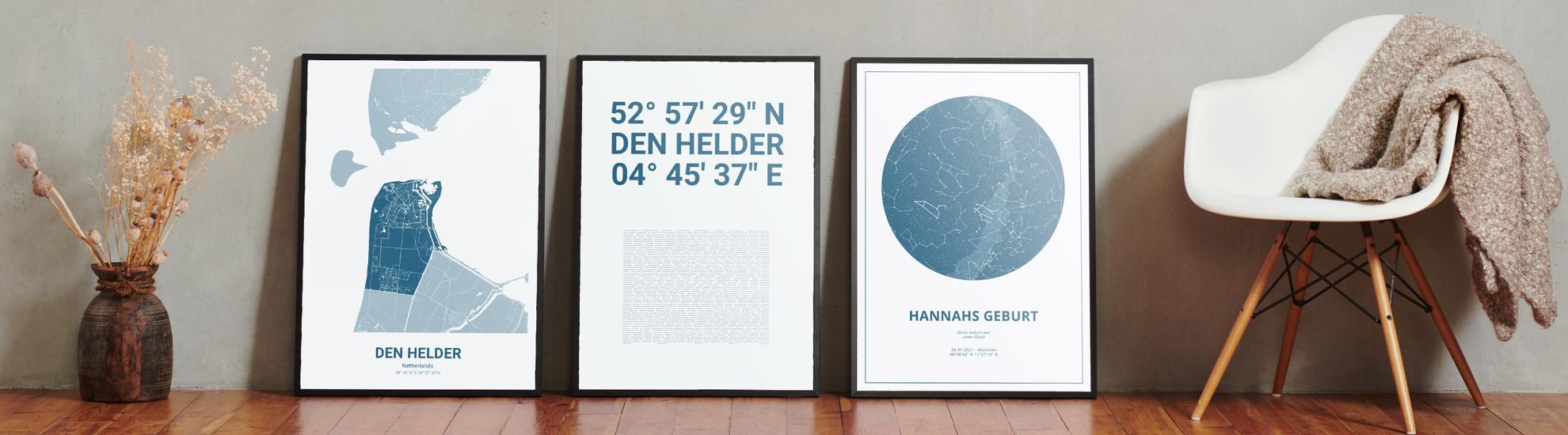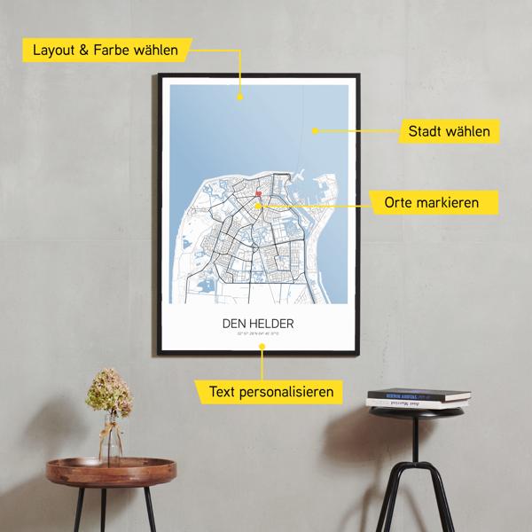 Wähle Farben und Layouts, die perfekt zu dir passen. Ob als klassische Karte in schwarz-weiß oder in modernen Farben. Bei Cartida kannst du ein Design in deinen Lieblingsfarben wählen. Erstelle eine Variante von Den Helder, die perfekt zu dir und deiner Wohnung passt.