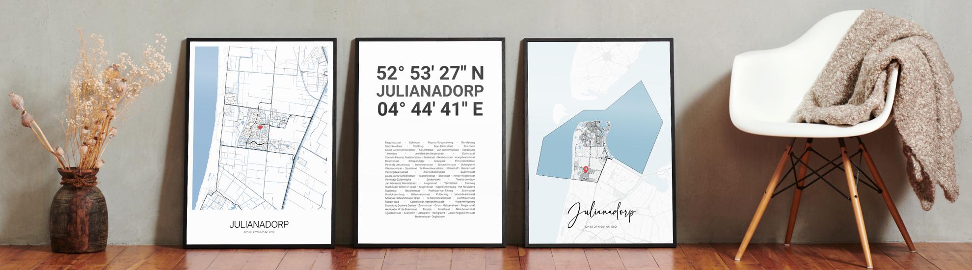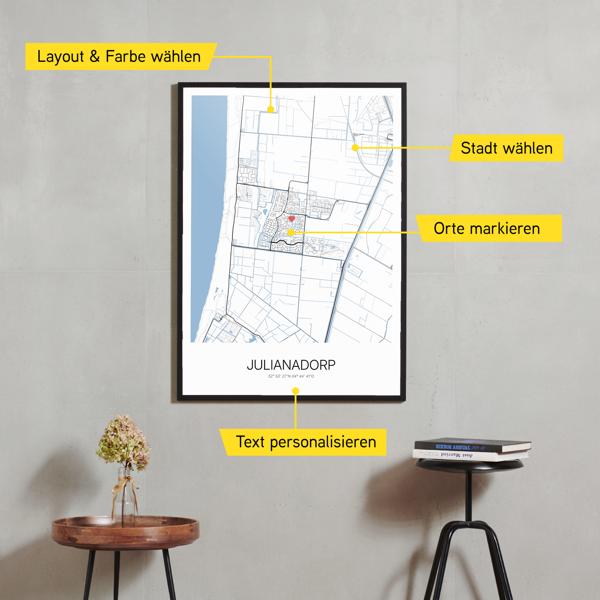 Wähle Farben und Layouts, die perfekt zu dir passen. Ob als klassische Karte in schwarz-weiß oder in modernen Farben. Bei Cartida kannst du ein Design in deinen Lieblingsfarben wählen. Erstelle eine Variante von Julianadorp, die perfekt zu dir und deiner Wohnung passt.