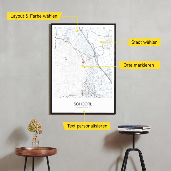 Wähle Farben und Layouts, die perfekt zu dir passen. Ob als klassische Karte in schwarz-weiß oder in modernen Farben. Bei Cartida kannst du ein Design in deinen Lieblingsfarben wählen. Erstelle eine Variante von Schoorl, die perfekt zu dir und deiner Wohnung passt.