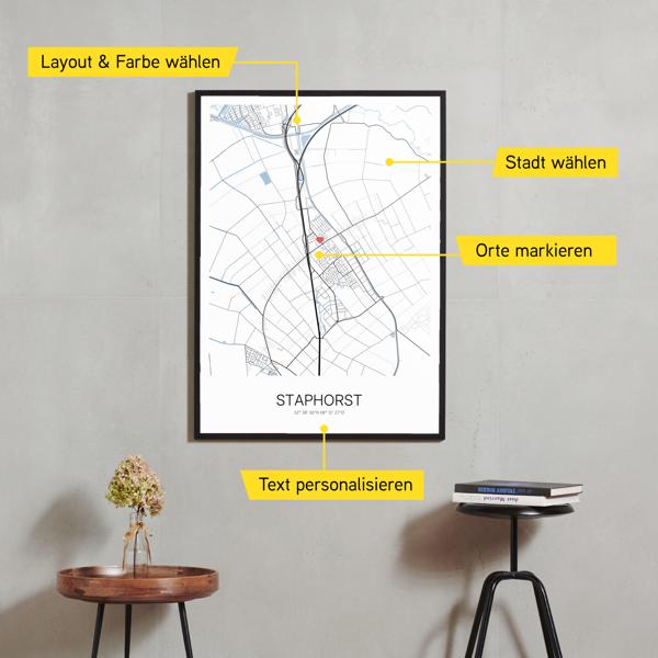 Wähle Farben und Layouts, die perfekt zu dir passen. Ob als klassische Karte in schwarz-weiß oder in modernen Farben. Bei Cartida kannst du ein Design in deinen Lieblingsfarben wählen. Erstelle eine Variante von Staphorst, die perfekt zu dir und deiner Wohnung passt.