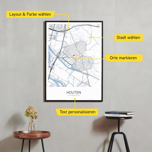 Wähle Farben und Layouts, die perfekt zu dir passen. Ob als klassische Karte in schwarz-weiß oder in modernen Farben. Bei Cartida kannst du ein Design in deinen Lieblingsfarben wählen. Erstelle eine Variante von Houten, die perfekt zu dir und deiner Wohnung passt.