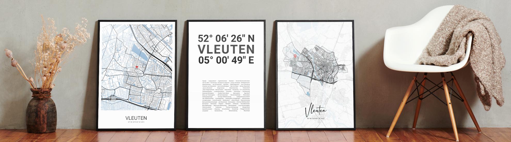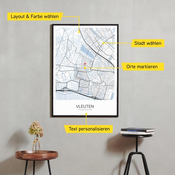 Wähle Farben und Layouts, die perfekt zu dir passen. Ob als klassische Karte in schwarz-weiß oder in modernen Farben. Bei Cartida kannst du ein Design in deinen Lieblingsfarben wählen. Erstelle eine Variante von Vleuten, die perfekt zu dir und deiner Wohnung passt.