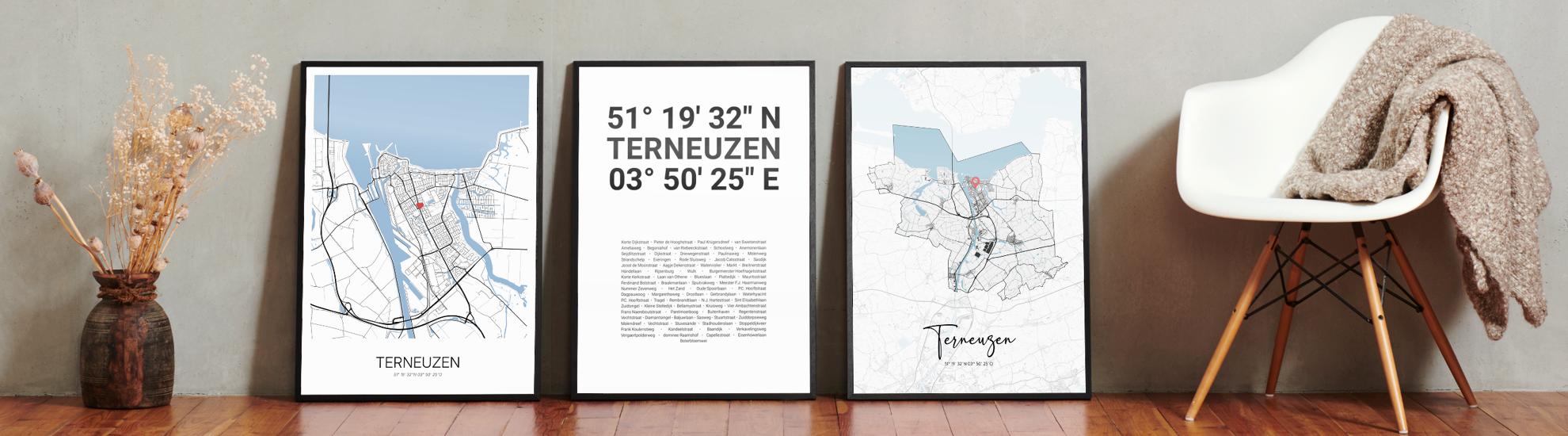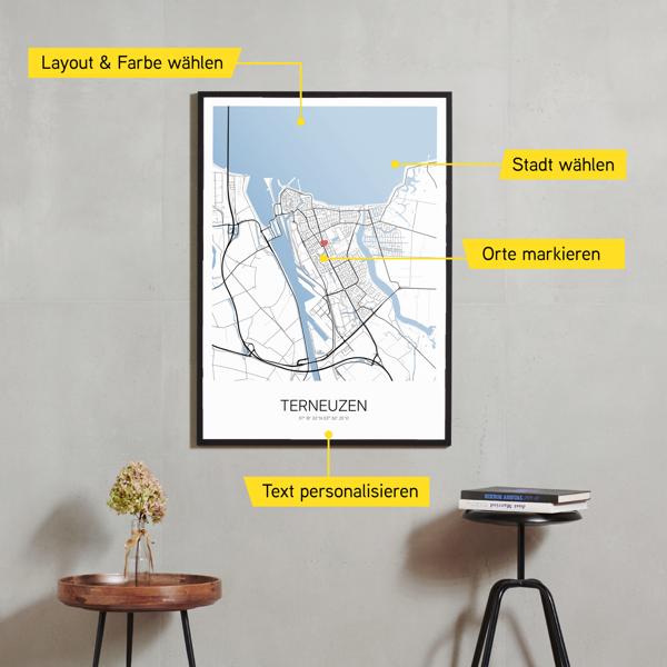 Wähle Farben und Layouts, die perfekt zu dir passen. Ob als klassische Karte in schwarz-weiß oder in modernen Farben. Bei Cartida kannst du ein Design in deinen Lieblingsfarben wählen. Erstelle eine Variante von Terneuzen, die perfekt zu dir und deiner Wohnung passt.