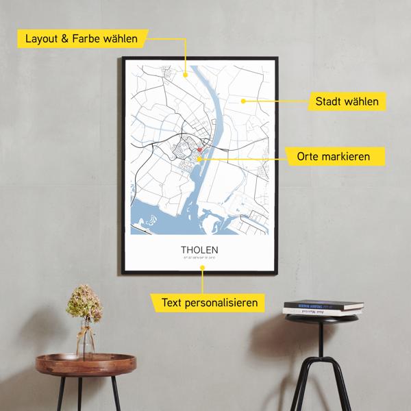 Wähle Farben und Layouts, die perfekt zu dir passen. Ob als klassische Karte in schwarz-weiß oder in modernen Farben. Bei Cartida kannst du ein Design in deinen Lieblingsfarben wählen. Erstelle eine Variante von Tholen, die perfekt zu dir und deiner Wohnung passt.