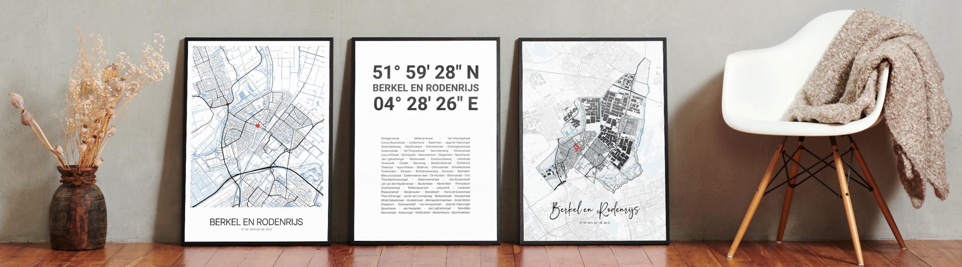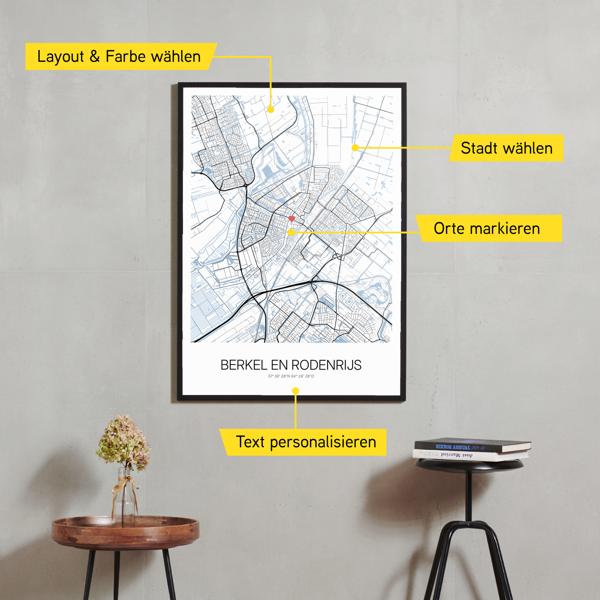 Wähle Farben und Layouts, die perfekt zu dir passen. Ob als klassische Karte in schwarz-weiß oder in modernen Farben. Bei Cartida kannst du ein Design in deinen Lieblingsfarben wählen. Erstelle eine Variante von Berkel en Rodenrijs, die perfekt zu dir und deiner Wohnung passt.