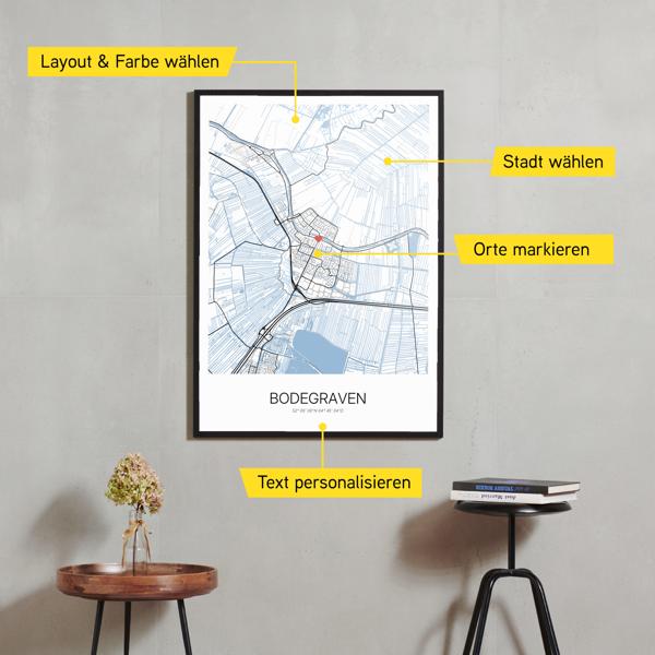 Wähle Farben und Layouts, die perfekt zu dir passen. Ob als klassische Karte in schwarz-weiß oder in modernen Farben. Bei Cartida kannst du ein Design in deinen Lieblingsfarben wählen. Erstelle eine Variante von Bodegraven, die perfekt zu dir und deiner Wohnung passt.