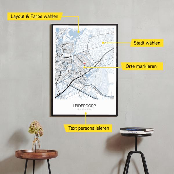 Wähle Farben und Layouts, die perfekt zu dir passen. Ob als klassische Karte in schwarz-weiß oder in modernen Farben. Bei Cartida kannst du ein Design in deinen Lieblingsfarben wählen. Erstelle eine Variante von Leiderdorp, die perfekt zu dir und deiner Wohnung passt.