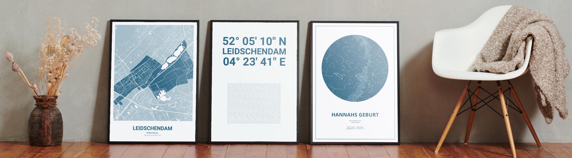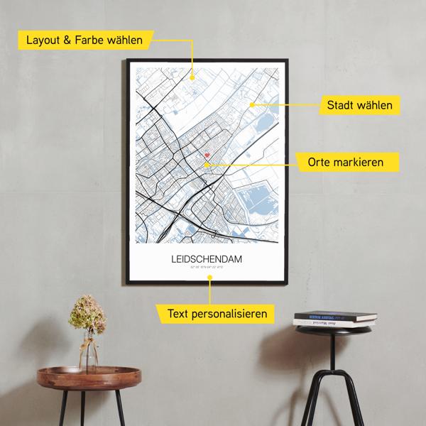 Wähle Farben und Layouts, die perfekt zu dir passen. Ob als klassische Karte in schwarz-weiß oder in modernen Farben. Bei Cartida kannst du ein Design in deinen Lieblingsfarben wählen. Erstelle eine Variante von Leidschendam, die perfekt zu dir und deiner Wohnung passt.