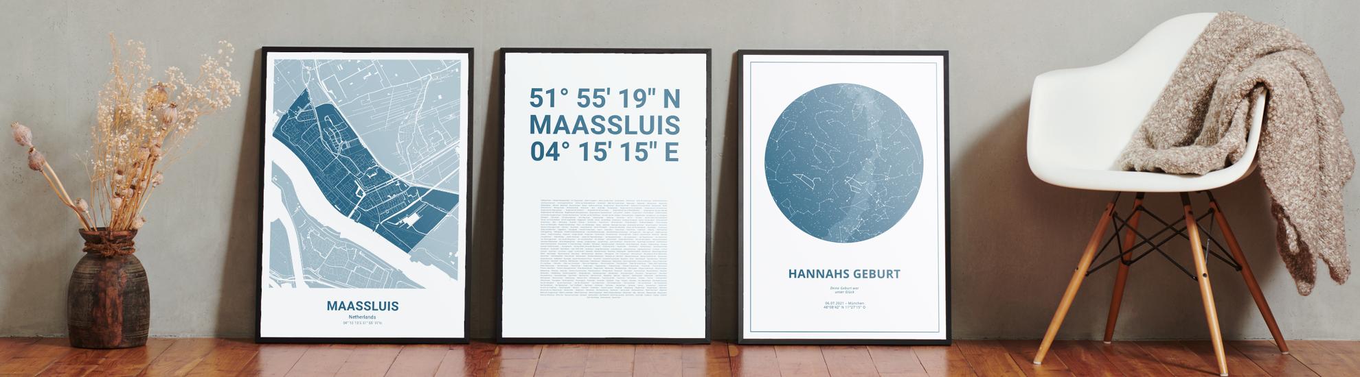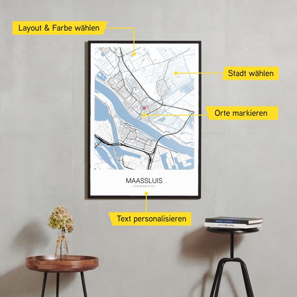 Wähle Farben und Layouts, die perfekt zu dir passen. Ob als klassische Karte in schwarz-weiß oder in modernen Farben. Bei Cartida kannst du ein Design in deinen Lieblingsfarben wählen. Erstelle eine Variante von Maassluis, die perfekt zu dir und deiner Wohnung passt.