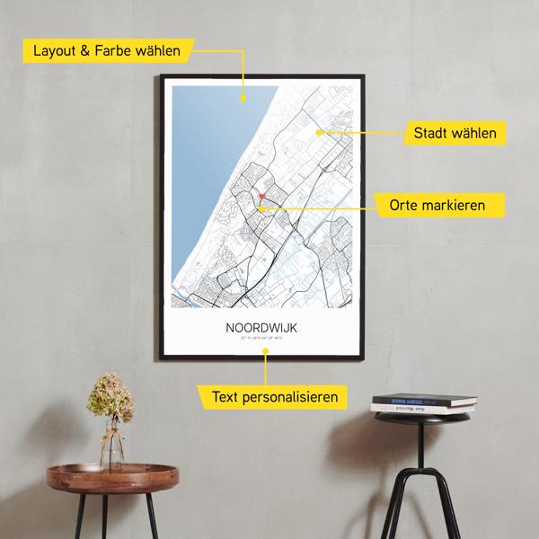 Wähle Farben und Layouts, die perfekt zu dir passen. Ob als klassische Karte in schwarz-weiß oder in modernen Farben. Bei Cartida kannst du ein Design in deinen Lieblingsfarben wählen. Erstelle eine Variante von Noordwijk, die perfekt zu dir und deiner Wohnung passt.