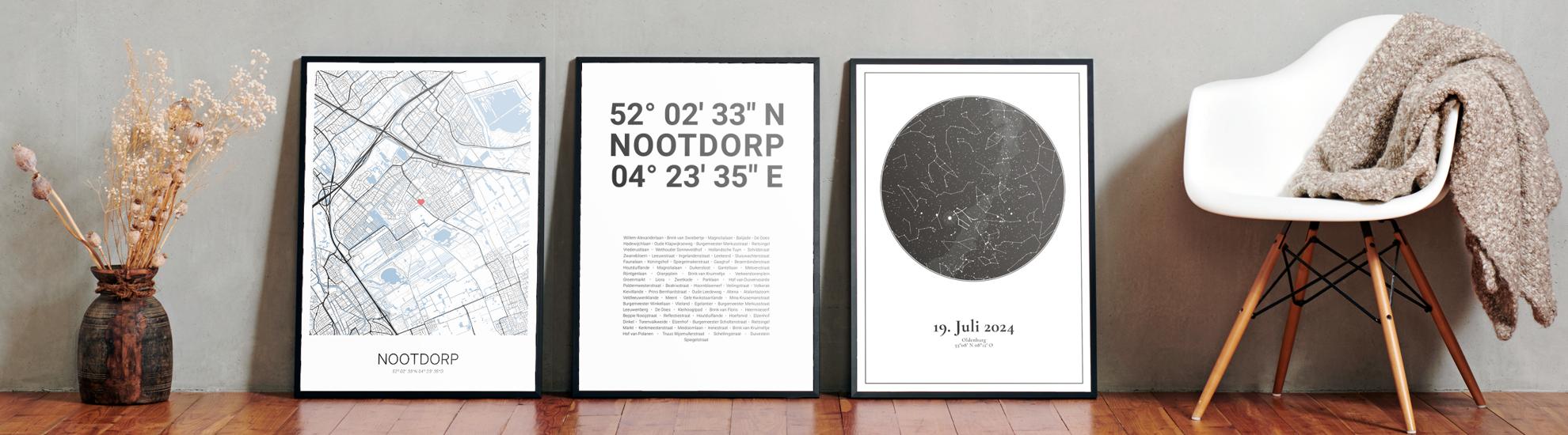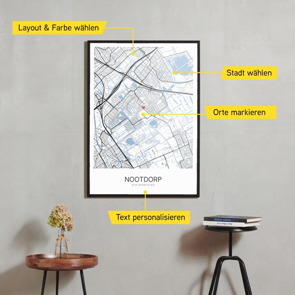 Wähle Farben und Layouts, die perfekt zu dir passen. Ob als klassische Karte in schwarz-weiß oder in modernen Farben. Bei Cartida kannst du ein Design in deinen Lieblingsfarben wählen. Erstelle eine Variante von Nootdorp, die perfekt zu dir und deiner Wohnung passt.