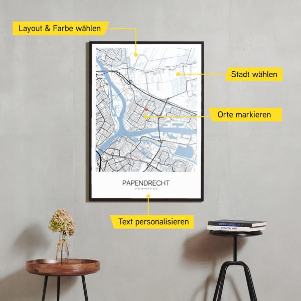 Wähle Farben und Layouts, die perfekt zu dir passen. Ob als klassische Karte in schwarz-weiß oder in modernen Farben. Bei Cartida kannst du ein Design in deinen Lieblingsfarben wählen. Erstelle eine Variante von Papendrecht, die perfekt zu dir und deiner Wohnung passt.