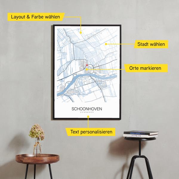 Wähle Farben und Layouts, die perfekt zu dir passen. Ob als klassische Karte in schwarz-weiß oder in modernen Farben. Bei Cartida kannst du ein Design in deinen Lieblingsfarben wählen. Erstelle eine Variante von Schoonhoven, die perfekt zu dir und deiner Wohnung passt.