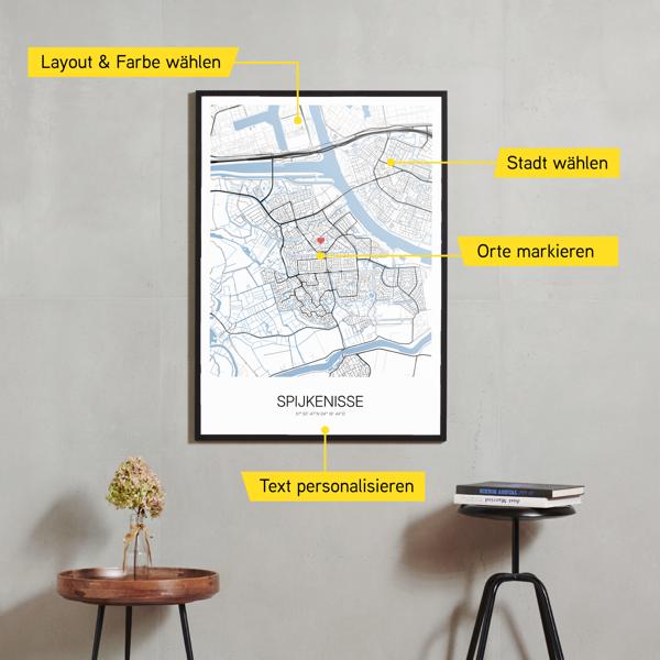 Wähle Farben und Layouts, die perfekt zu dir passen. Ob als klassische Karte in schwarz-weiß oder in modernen Farben. Bei Cartida kannst du ein Design in deinen Lieblingsfarben wählen. Erstelle eine Variante von Spijkenisse, die perfekt zu dir und deiner Wohnung passt.