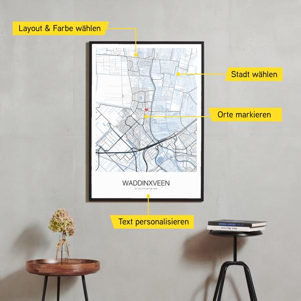 Wähle Farben und Layouts, die perfekt zu dir passen. Ob als klassische Karte in schwarz-weiß oder in modernen Farben. Bei Cartida kannst du ein Design in deinen Lieblingsfarben wählen. Erstelle eine Variante von Waddinxveen, die perfekt zu dir und deiner Wohnung passt.