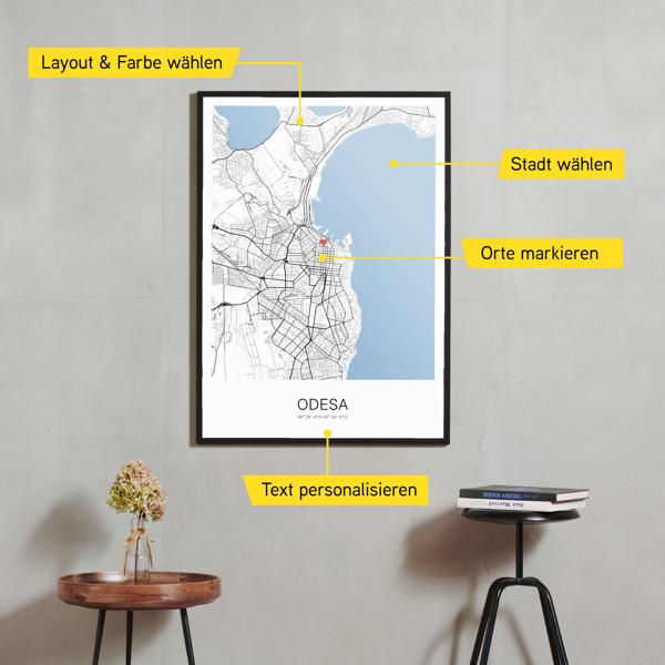 Wähle Farben und Layouts, die perfekt zu dir passen. Ob als klassische Karte in schwarz-weiß oder in modernen Farben. Bei Cartida kannst du ein Design in deinen Lieblingsfarben wählen. Erstelle eine Variante von Odesa, die perfekt zu dir und deiner Wohnung passt.