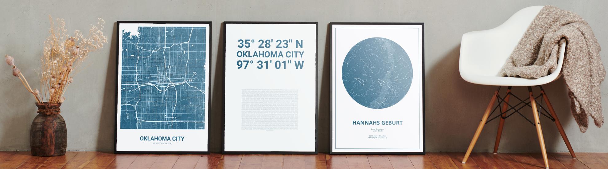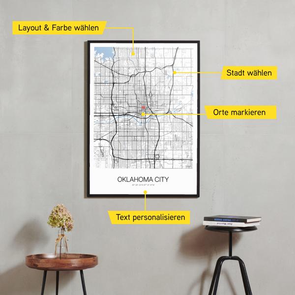 Wähle Farben und Layouts, die perfekt zu dir passen. Ob als klassische Karte in schwarz-weiß oder in modernen Farben. Bei Cartida kannst du ein Design in deinen Lieblingsfarben wählen. Erstelle eine Variante von Oklahoma City, die perfekt zu dir und deiner Wohnung passt.