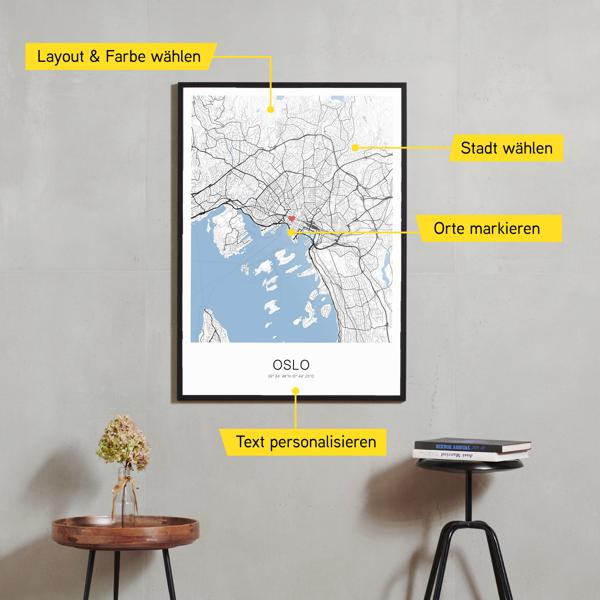 Wähle Farben und Layouts, die perfekt zu dir passen. Ob als klassische Karte in schwarz-weiß oder in modernen Farben. Bei Cartida kannst du ein Design in deinen Lieblingsfarben wählen. Erstelle eine Variante von Oslo, die perfekt zu dir und deiner Wohnung passt.