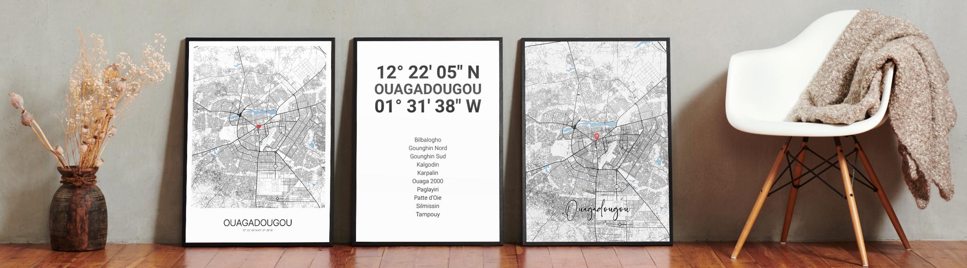 Wähle Farben und Layouts, die perfekt zu dir passen. Ob als klassische Karte in schwarz-weiß oder in modernen Farben. Bei Cartida kannst du ein Design in deinen Lieblingsfarben wählen. Erstelle eine Variante von Ouagadougou, die perfekt zu dir und deiner Wohnung passt.