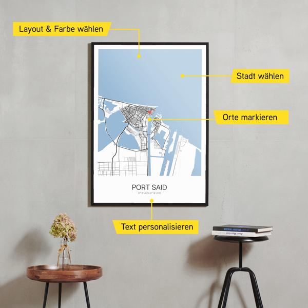 Wähle Farben und Layouts, die perfekt zu dir passen. Ob als klassische Karte in schwarz-weiß oder in modernen Farben. Bei Cartida kannst du ein Design in deinen Lieblingsfarben wählen. Erstelle eine Variante von Port Said, die perfekt zu dir und deiner Wohnung passt.