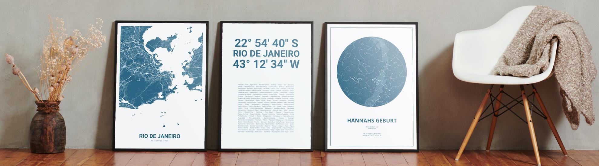 Zahlen, die die Welt bedeuten. Erstelle jetzt dein persönliches Koordinaten-Kunstwerk von deiner Lieblingsstadt. Entscheide selbst, ob Stadtteile, Straßen oder ganz eigene Texte abgedruckt werden. Perfekt als Geschenk zum Einzug oder für die eigenen vier Wände.