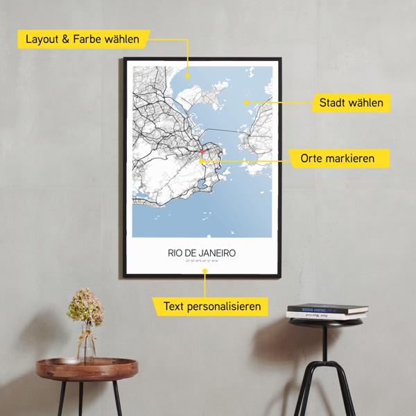 Wähle Farben und Layouts, die perfekt zu dir passen. Ob als klassische Karte in schwarz-weiß oder in modernen Farben. Bei Cartida kannst du ein Design in deinen Lieblingsfarben wählen. Erstelle eine Variante von Rio de Janeiro, die perfekt zu dir und deiner Wohnung passt.