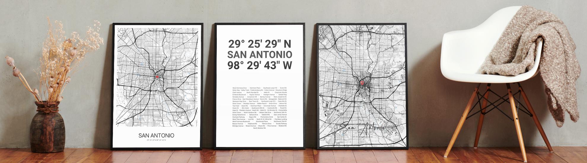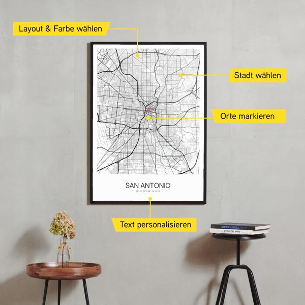 Wähle Farben und Layouts, die perfekt zu dir passen. Ob als klassische Karte in schwarz-weiß oder in modernen Farben. Bei Cartida kannst du ein Design in deinen Lieblingsfarben wählen. Erstelle eine Variante von San Antonio, die perfekt zu dir und deiner Wohnung passt.