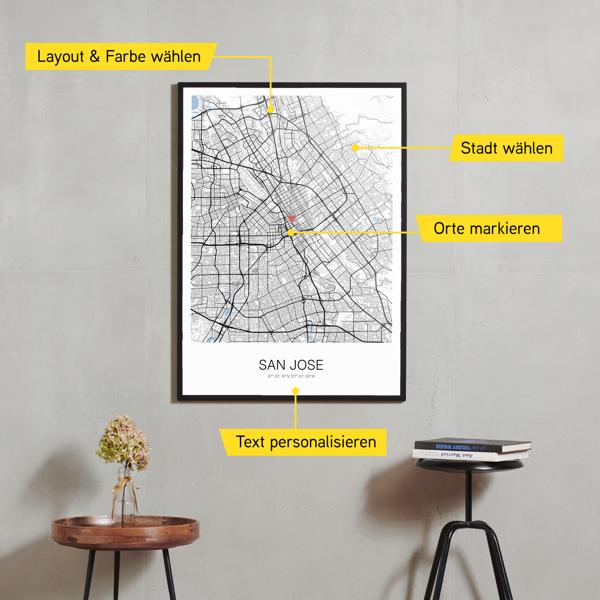 Wähle Farben und Layouts, die perfekt zu dir passen. Ob als klassische Karte in schwarz-weiß oder in modernen Farben. Bei Cartida kannst du ein Design in deinen Lieblingsfarben wählen. Erstelle eine Variante von San Jose, die perfekt zu dir und deiner Wohnung passt.