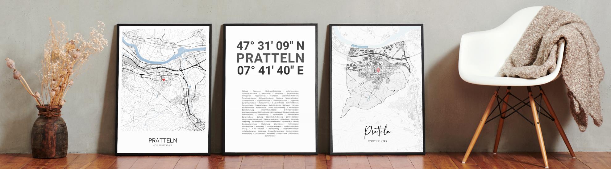 Wähle Farben und Layouts, die perfekt zu dir passen. Ob als klassische Karte in schwarz-weiß oder in modernen Farben. Bei Cartida kannst du ein Design in deinen Lieblingsfarben wählen. Erstelle eine Variante von Pratteln, die perfekt zu dir und deiner Wohnung passt.