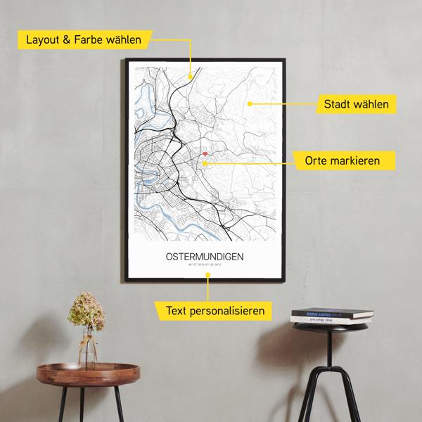 Wähle Farben und Layouts, die perfekt zu dir passen. Ob als klassische Karte in schwarz-weiß oder in modernen Farben. Bei Cartida kannst du ein Design in deinen Lieblingsfarben wählen. Erstelle eine Variante von Ostermundigen, die perfekt zu dir und deiner Wohnung passt.