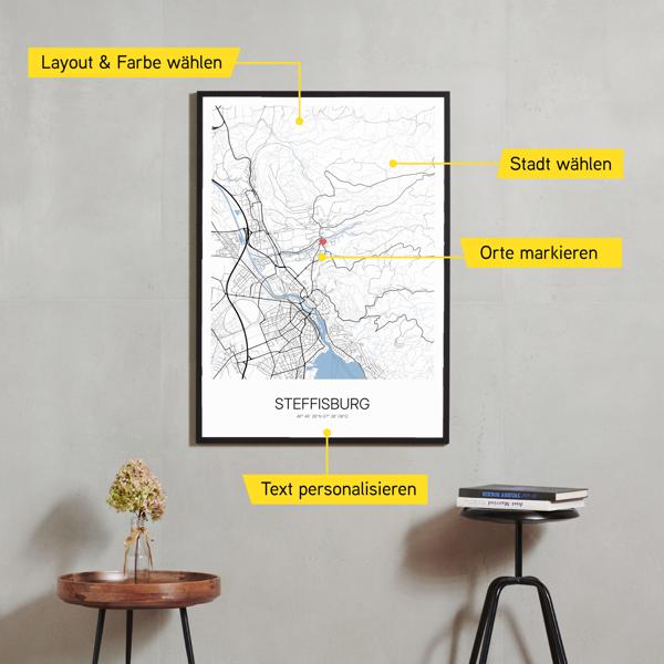 Wähle Farben und Layouts, die perfekt zu dir passen. Ob als klassische Karte in schwarz-weiß oder in modernen Farben. Bei Cartida kannst du ein Design in deinen Lieblingsfarben wählen. Erstelle eine Variante von Steffisburg, die perfekt zu dir und deiner Wohnung passt.