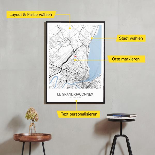 Wähle Farben und Layouts, die perfekt zu dir passen. Ob als klassische Karte in schwarz-weiß oder in modernen Farben. Bei Cartida kannst du ein Design in deinen Lieblingsfarben wählen. Erstelle eine Variante von Le Grand-Saconnex, die perfekt zu dir und deiner Wohnung passt.